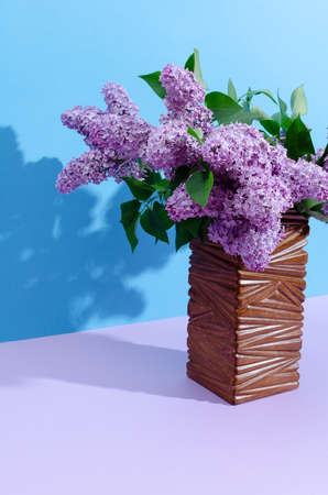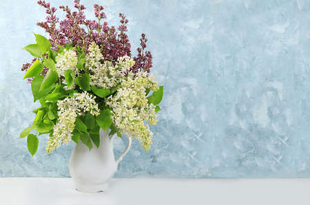 Bouquet of lilac flowers in a vase on blue background. Romantic summer syringa flowers.