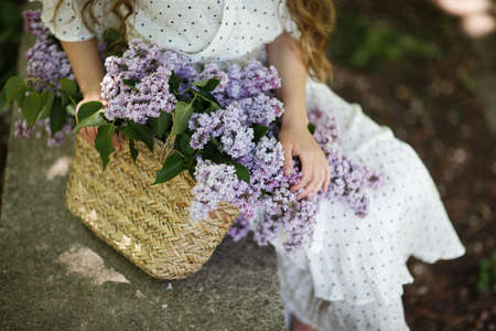 The girl holds in her hands a wicker basket with flowers. Basket with lilacs. girl and flowers. Walk with a basket of lilacs in the hands. Floristics