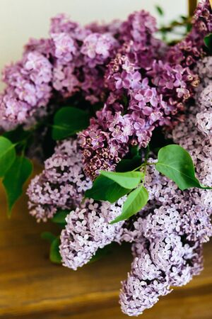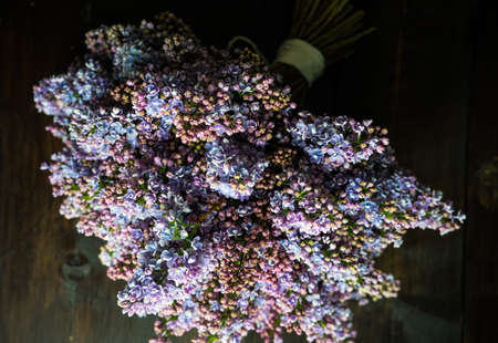Beautiful purple lilac flowers in a bunch on rustic background with copy space