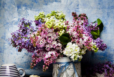 Vintage still life of lilac flowers, Springtime. Gentle floral muted garden flowers background.