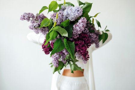 Happy young woman in a white shirt holding a bouquet of lilacs by her face. White brunette female covered her face on a light background. studio portrait.