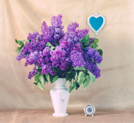 Lilac in a Vase, small heart-shaped mirror on the wall and elegant clock.