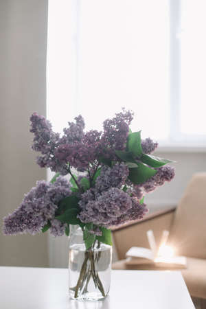 The concept of spring, home comfort, and celebration. A large purple bouquet of lilacs on the table. In the background, the interior of a modern living room.