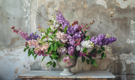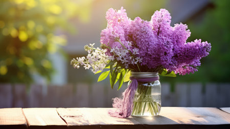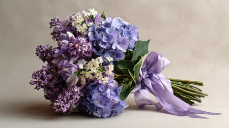 A stunning bouquet cluster features of lilacs and hydrangeas in various shades of purple, bound together with a delicate ribbon, perfect for celebrations or decoration.