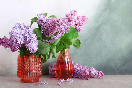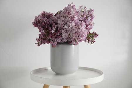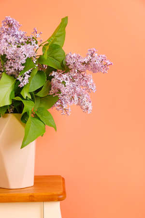 Home interior with decor elements, beautiful spring branches of lilacs in a vase on a light background, abstract flower arrangement, still life with place for text, floral birthday card, wedding, selective focus
