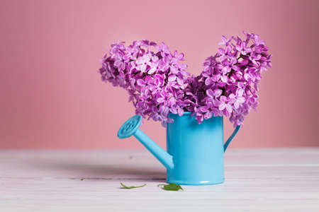 Vase in the form of an old vintage watering can with a bouquet of lilacs on a wooden table on a light background