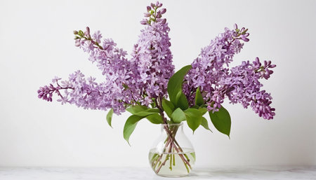A beautiful bouquet of fresh lilacs in a clear glass vase, featuring vibrant purple flowers and lush green leaves. Perfect for home decor or spring themes.