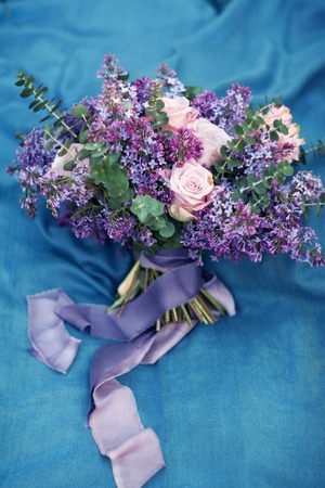 beautiful spring bouquet from a lilac and roses on blue fabric