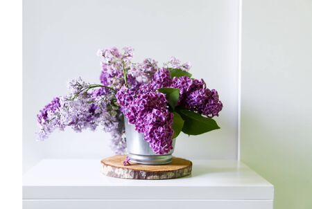 Bouquet of the beautiful spring purple lilac flowers on light background. Common Syringa plant. Natural decor. Floral composition on wooden slice in minimalist light interior