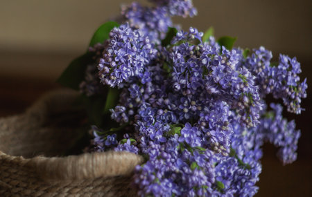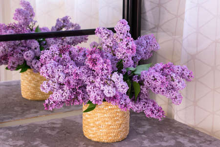 Bouquet of lilac in a wicker basket for background or copy space for text.