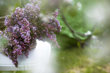 springtime. A beautiful bouquet of lilacs in a wicker basket of vines on a white bench in the spring garden. Beautiful postcard for printing. The concept of spring and holiday. copy of the text space