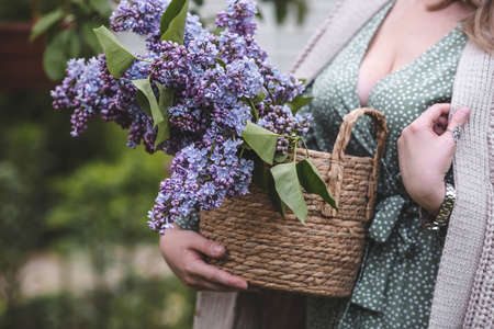 A woman's hands in close-up with a bouquet of lilacs in a wicker basket. Authenticity. Environmental friendliness. Content for a floral store. Sale of flowers.
