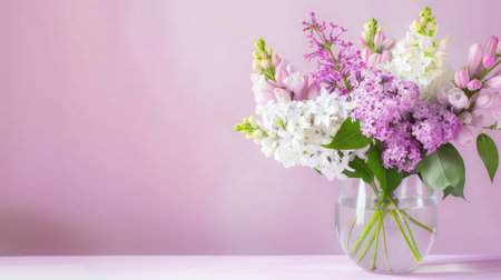 A stunning floral arrangement featuring lilacs, hyacinths, and snapdragons in a clear glass vase. The soft pink background enhances the beauty and freshness of the flowers, perfect for adding elegance to any space. Ideal for spring decor or events.