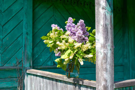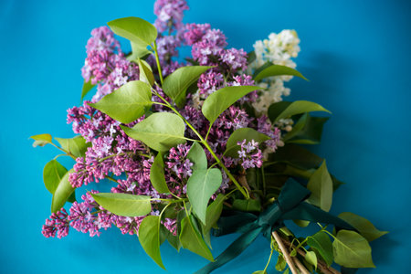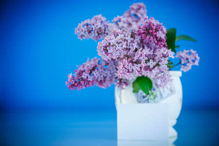 bouquet of purple lilac flowers on a blue wooden plank background. with space for posting information