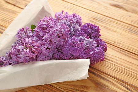 Bouquet of beautiful spring lilacs of different colors on a wooden table