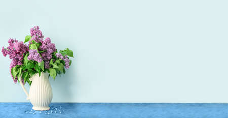 Vase with bouquet of beautiful lilac on table against light blue background with space for text