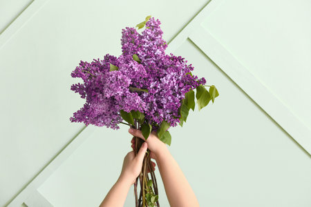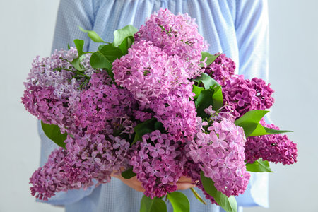 Young woman holding bouquet of beautiful lilac flowers near white wall