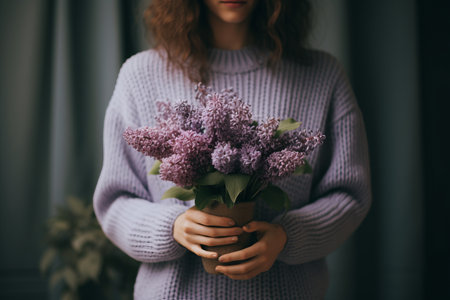 Lilac Splendor: A Woman Embracing Nature in Knitted Sweater