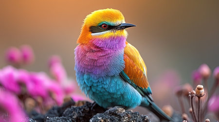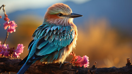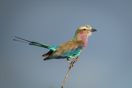 lilac-breasted roller (Coracias caudatus) catching early morning low light showing off its full colour range in Tarangire national Park.