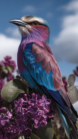 Very colourful Lilac-breasted Roller (Coracias Caudatus) sitting on the top branch of a tree against a patchy blue sky with wispy clouds