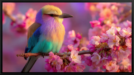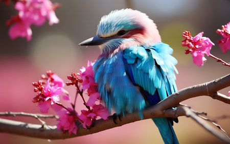A colorful Lilac-breasted Roller (Coracias caudatus) perched on a tree in Serengeti National Park, Tanzania