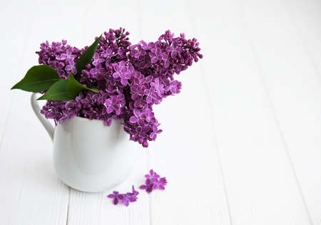 Bouquet of beautiful blooming lilacs in a white vase on a white wooden background. International Women's Day. Mother's day. Close up.