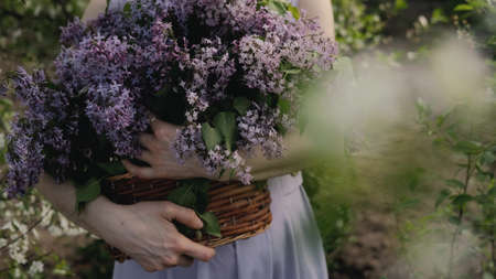 A large basket with garden fresh spring flowers in the hands of a woman. A bouquet of lilacs with a krypny plan.