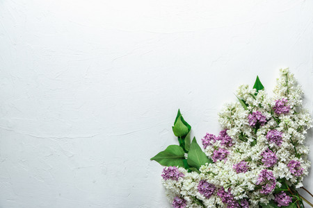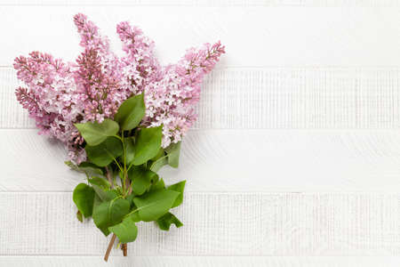 Bunch of garden lilac flowers on white wooden table. Flat lay with copy space
