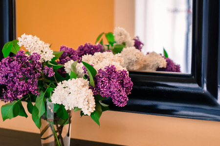 Beautiful lilac flowers on windowsill in sunny room. Summer cottage decor with flowers. Pink and purple lilacs in rustic home.