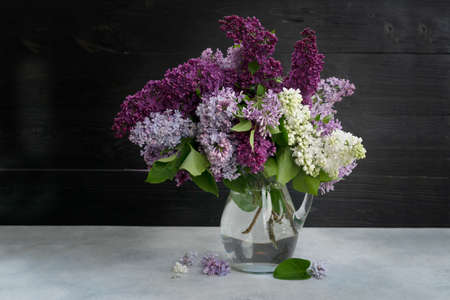 Bouquet of beautiful spring lilacs of different colors on a wooden table
