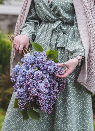 Hands of a woman in close-up with a bouquet of lilacs. Authenticity. Environmental friendliness. Content for a floral store. Sale of flowers.