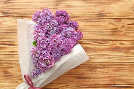Beautiful lilac flowers on wooden background