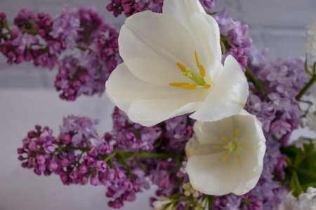 Colorful lilac spring flowers bouquet in a vase