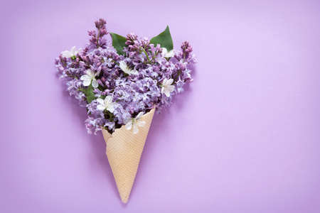 Spring lilac in ice cream cone with copy space