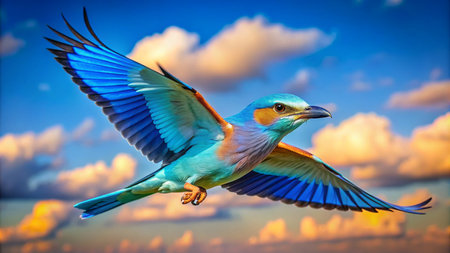 Lilac-breasted roller in flight, displaying stunning violet, blue, and turquoise feathers against a warm savanna backdrop at sunrise or sunset. Bird.
