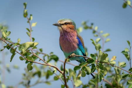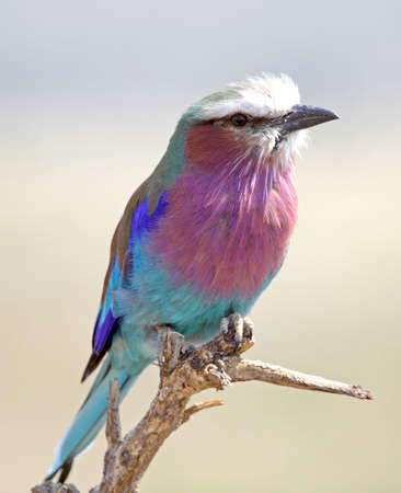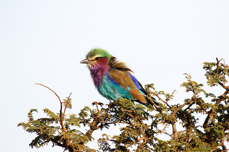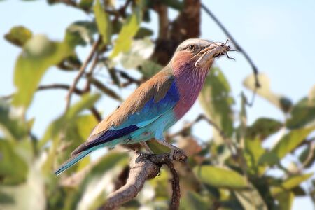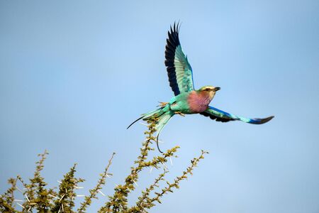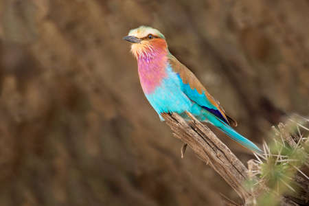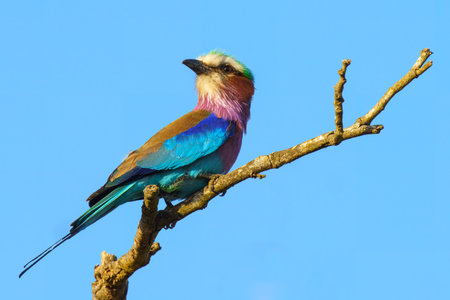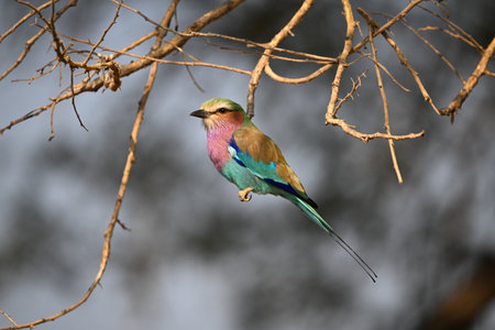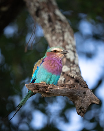 A colorful Lilac-breasted Roller (Coracias caudatus) perched on a tree in Serengeti National Park, Tanzania