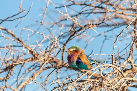 Telephoto of one of the most beautiful birds in the world, the Lilac Breasted Roller - Coracias caudatus- sitting on a tree branch, in Etosha National Park.