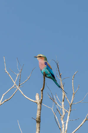 Lilac-breasted roller (Coracias caudatus) sitting on a dry tree