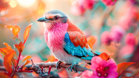A vibrant bird with striking colors sits on a branch among blooming pink flowers, creating a peaceful and beautiful scene in nature.