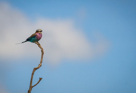 Very colourful Lilac-breasted Roller (Coracias Caudatus) sitting on the top branch of a tree against a patchy blue sky with wispy clouds