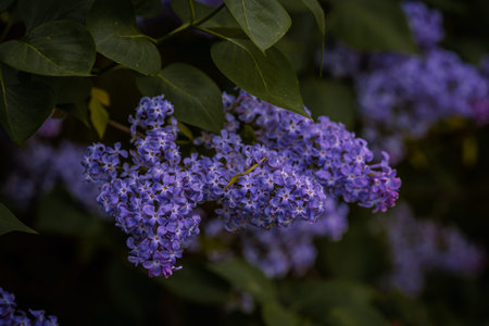 In the spring, beautiful purple lilac flowers bloom, creating a stunning sight in the evening twilight. Macro photography captures the delicate petals and intricate details of these flowers.