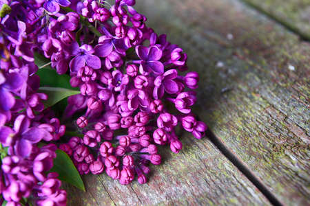 bouquet of purple lilac flowers on a blue wooden plank background. with space for posting information
