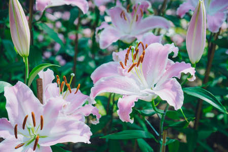 Lily flowers blooming in the garden in the summer. Nature background.