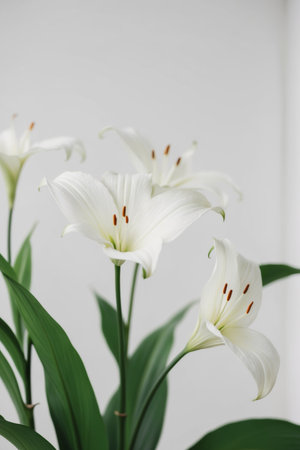 Beautiful white lily on a light and delicate background. Copy space for your text or advertisement.
