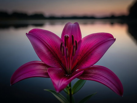 Pink lily flower on the background of a lake in the evening