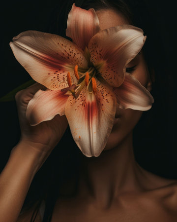 Close up of a woman holding a large lily flower, partially obscuring her face against a dark background Elegant and intimate composition