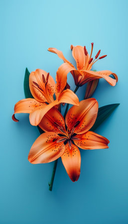 Three Vibrant Orange Lilies in Full Bloom, Isolated on a Striking Blue Background with Copy Space