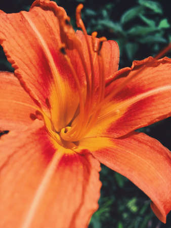 Fresh and delicious-smelling orange red and yellow Holland lily flower hybrid with stamens and green leaves close up in garden nature outdoor blurred smooth background. Day morning bright solar glare
