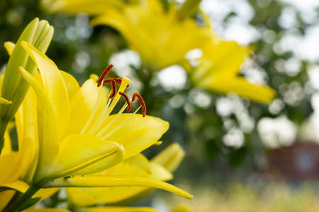 Yellow lily flowers in the garden. Floral natural background.