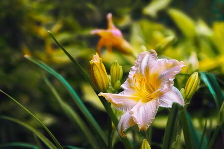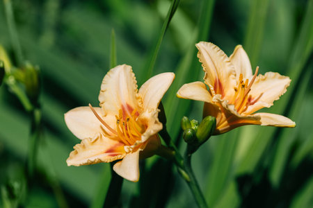 Beautiful light orange flowers daylilies close up on green background. Blooming Hemerocallis On And On.